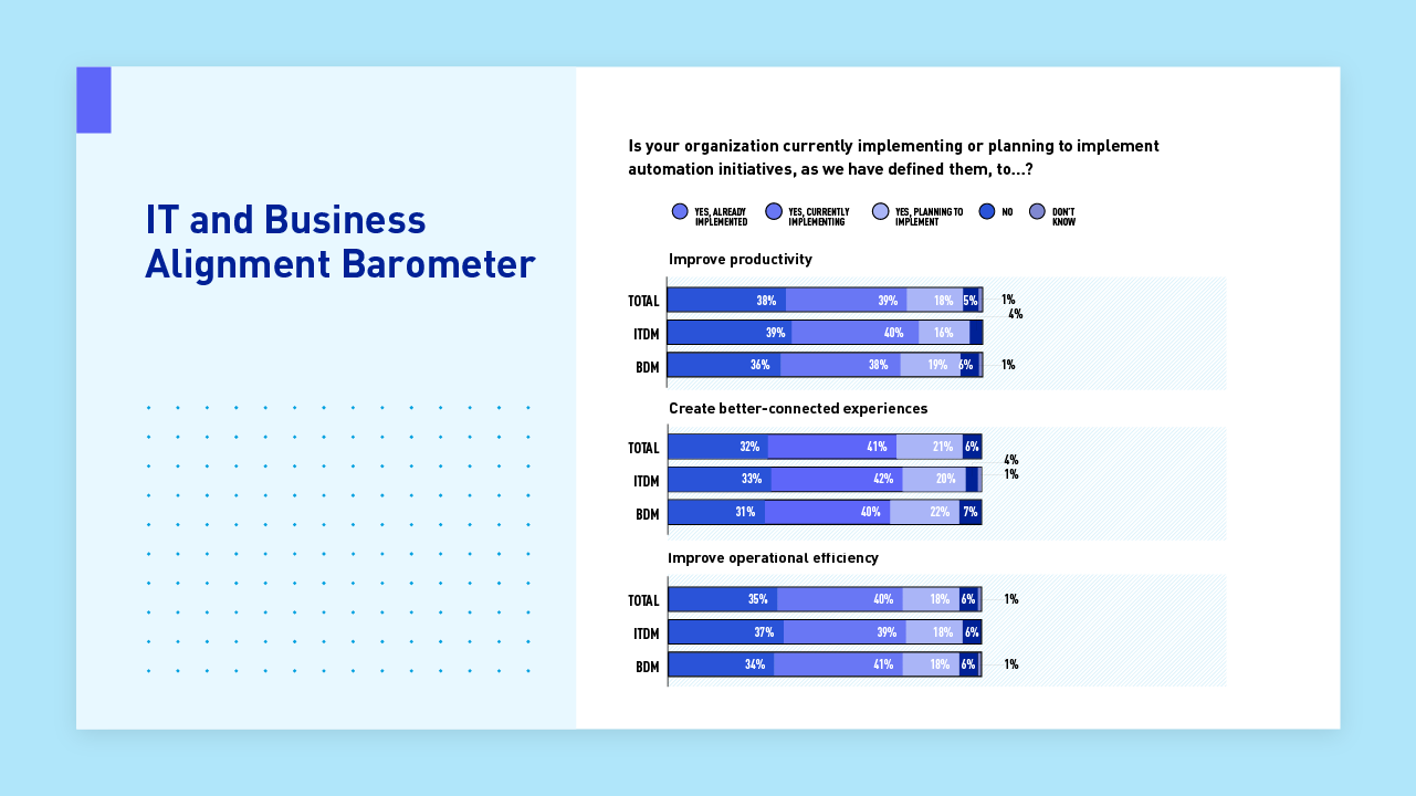 - There’s automation everywhere: 95% of organizations have implemented or are in the process of implementing automation initiatives, such as streamlined employee onboarding processes, to improve productivity. 93% see automation as a means to create better connected customer experiences and to improve operational efficiency.