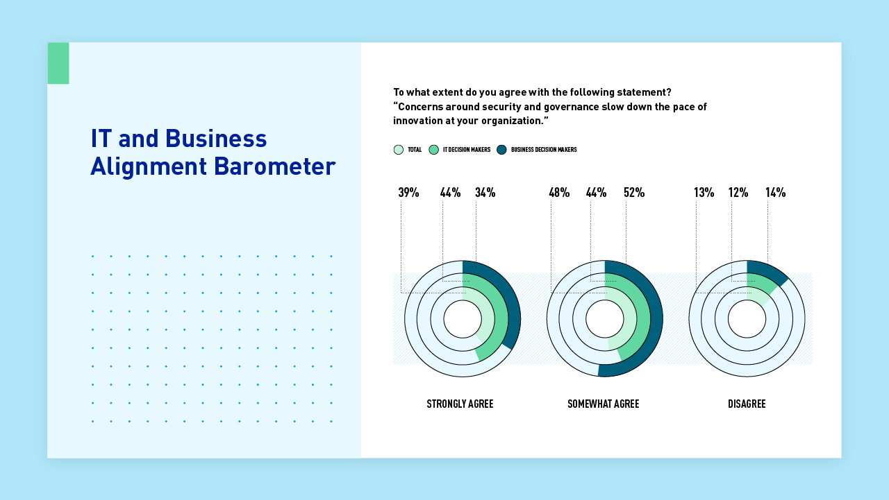- Security concerns slowing down the pace of innovation: The majority (87%) of IT and business leaders say that security and governance concerns are slowing down the pace of innovation.