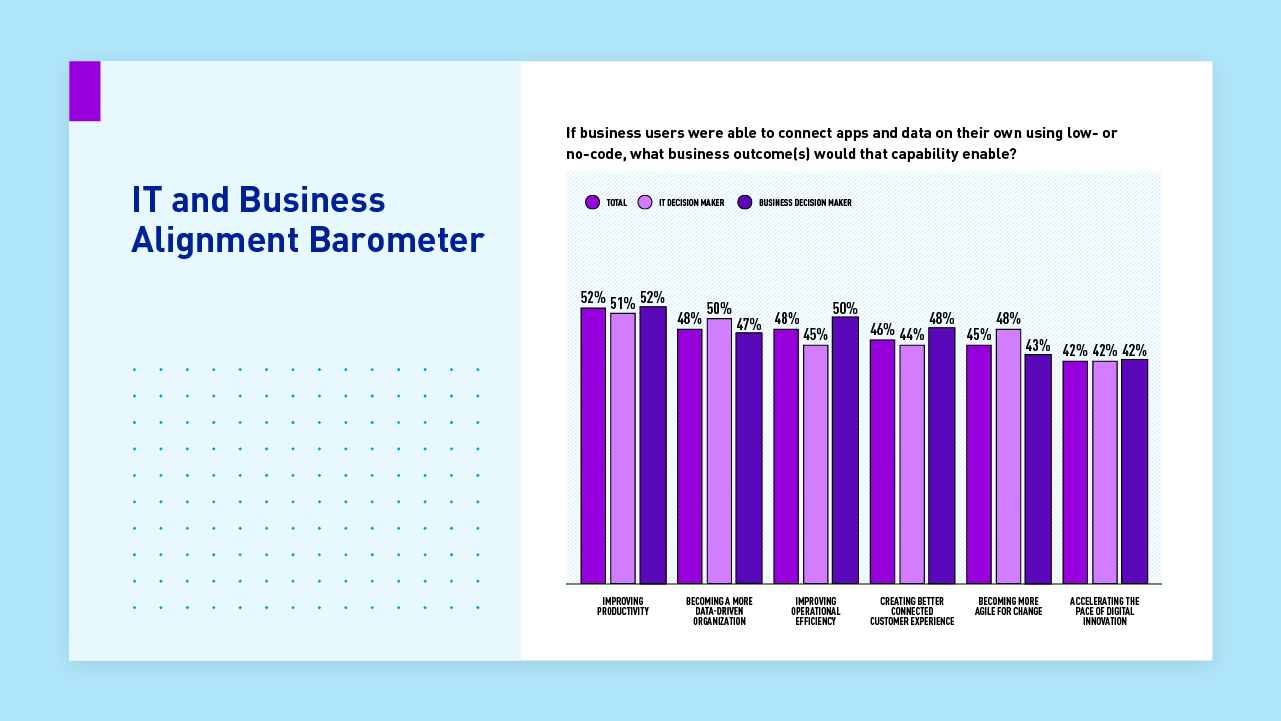 - Drive agility by empowering business users to create connected experiences: The vast majority (86%) of organizations agree business outcomes would improve if business users were able to use low or no code to securely connect apps and data on their own to create connected experiences. This capability would enable organizations to improve productivity (52%), become more data-driven (48%), improve operational efficiency (48%), create better connected customer experiences (46%), and become more agile for change (45%).